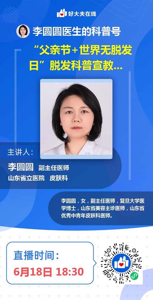 6月18日18:30-19:45,皮肤科李圆圆副主任医师进行了线上科普讲座《帮你远离“秃顶”的烦恼》,向参会人员普及了毛发生长周期等基本毛发知识,介绍了雄激素性秃发的发病机制与临床表现、如何进行诊断、有哪些治疗方法,解答了人们对部分治疗方法的常见疑问与顾虑,告诉大家日常生活中爱发护发的注意事项,并展示了成功治疗雄激素性秃发的病例,给受脱发困扰的父亲们带来了鼓舞与希望。共有近400人线上参加讲座。讲座结束后,李圆圆进行了在线答疑,答疑40余人次。